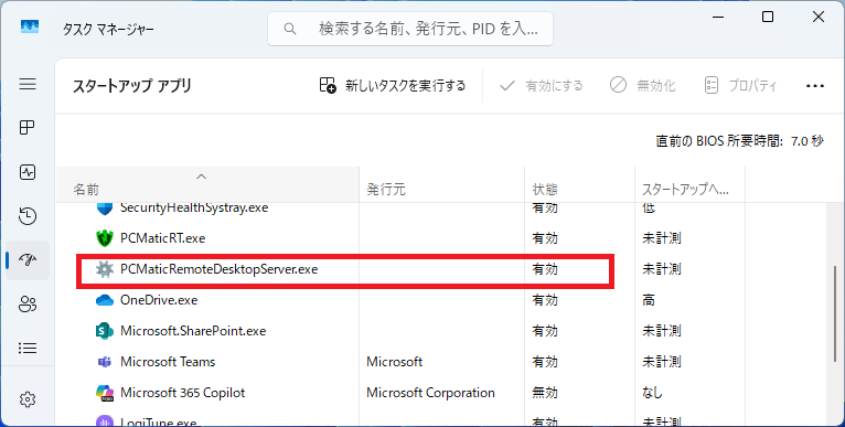 インストール時に「リモートデスクトップ機能」を含めないインストーラーで導入した際は、「タスクマネージャー」の「スタートアップ」にて、「PCMatic Remote Desktop Server.exeが存在しません。再度リモートデスクトップを含むインストーラーを上書きインストールしてサービスを組み込んでください。